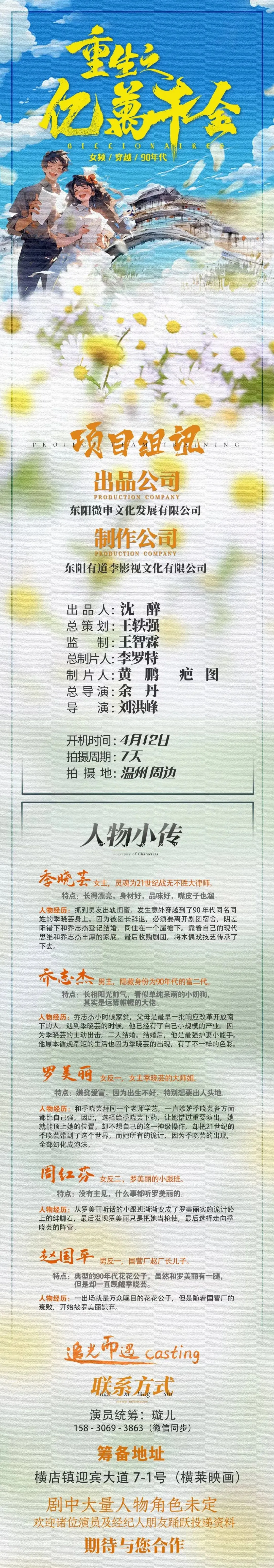 剧中大量人物角色未定,欢迎诸位演员及经纪人朋友踊跃投递资料,期待与您合作。
