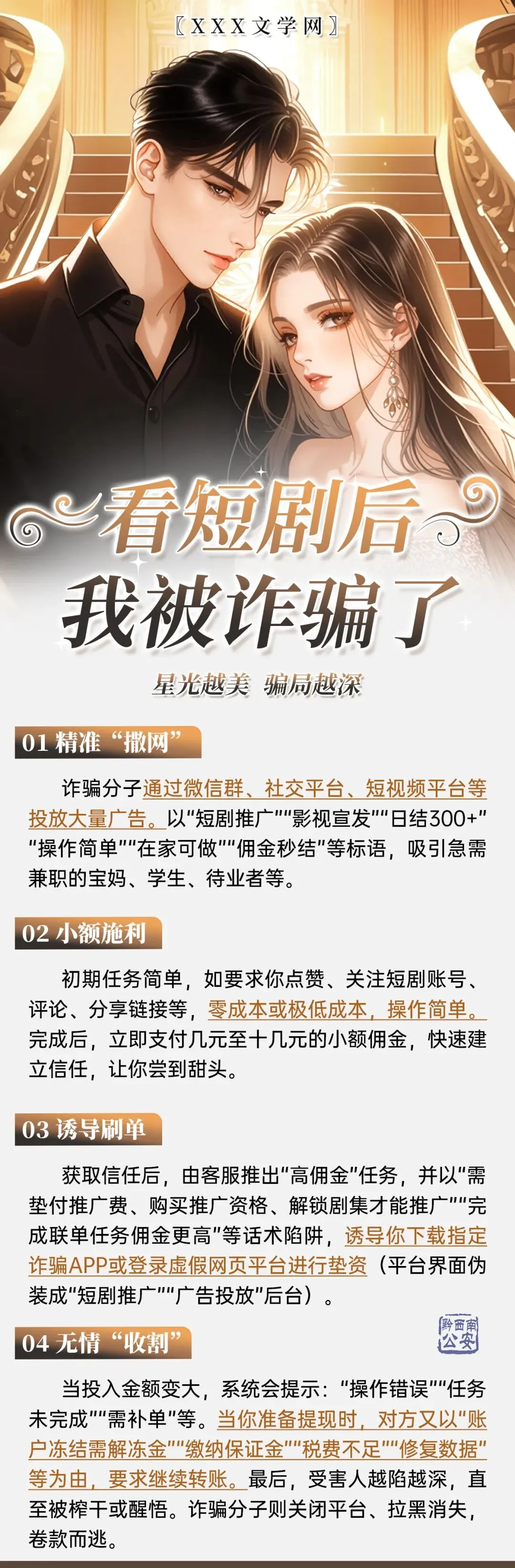 近日,晴隆县刘某(化名)在刷短视频时,看到一名为“名浩短剧”的用户发布视频,声称可以带人做短剧赚钱。刘某添加对方为好友后,对方以“绑定银行卡购买金币,可解锁剧情获返利”为由,诱导刘某进行刷单任务,被骗共计4900元。