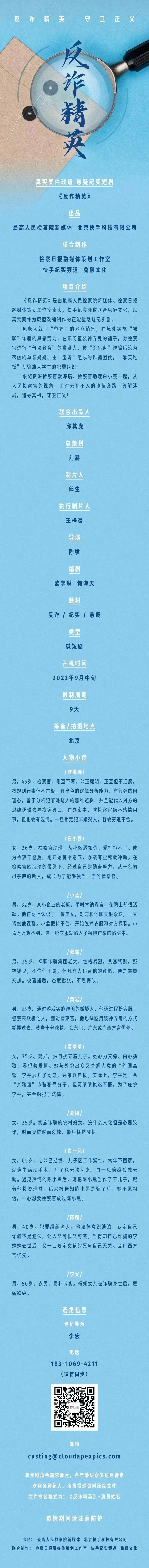 欢迎各经纪人、演员投递资料压缩文件文件命名格式为:《反诈精英》+演员姓名