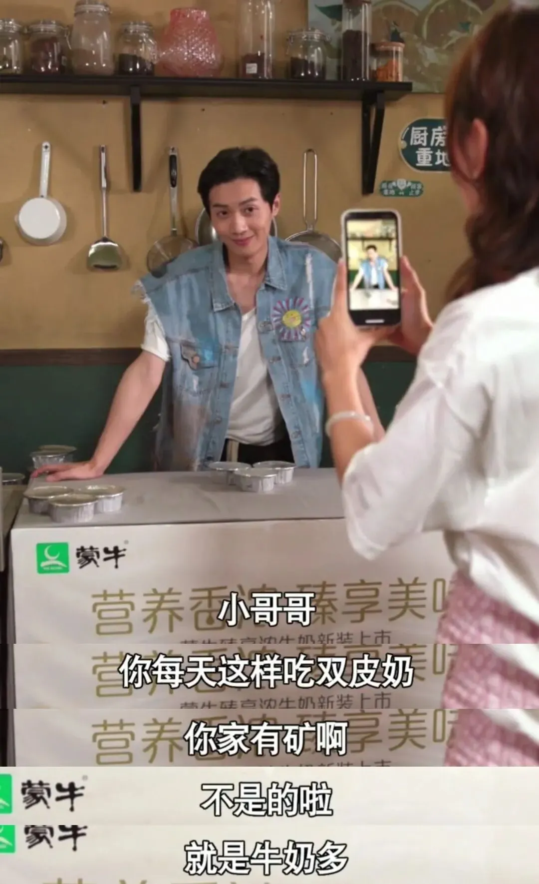 除了冰柜、光盘行动标签、柜台海报、围裙、臻宝抱枕等男主店内陈设场景化的臻享元素,臻享还是男女主名字的缩写,甚至还出现在了男主角的梦里,最绝的是,男主角本人还总爱穿白汗衫加绿短裤,简直是行走的臻享牛奶,不愧叫“陈臻”哈哈哈哈哈。