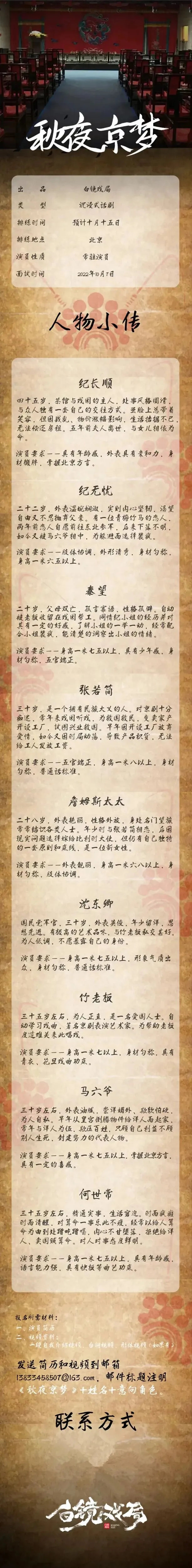 邮件标题注明《秋夜京梦》+姓名+意向角色。