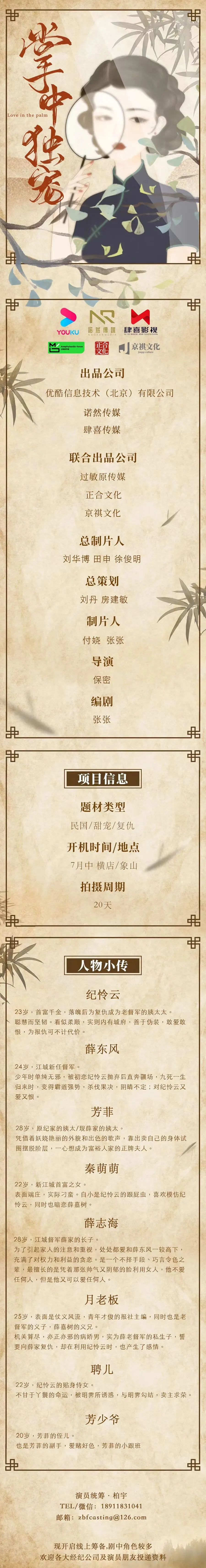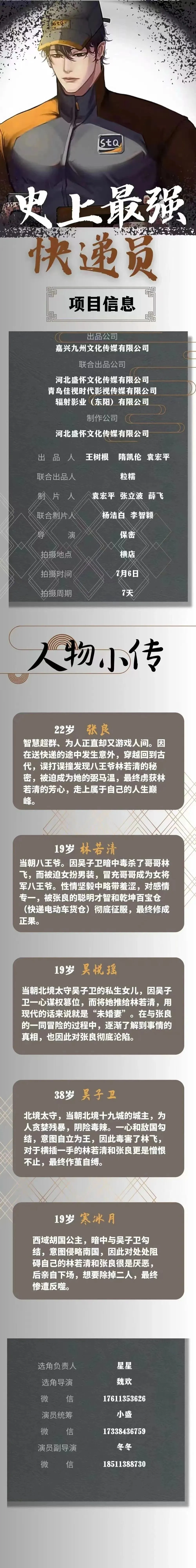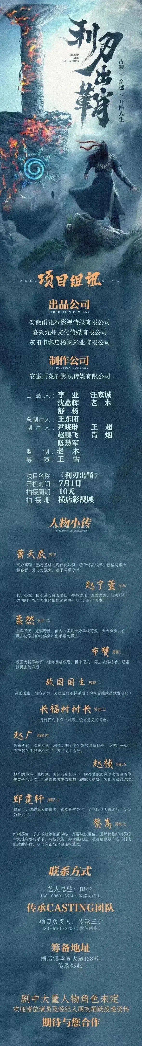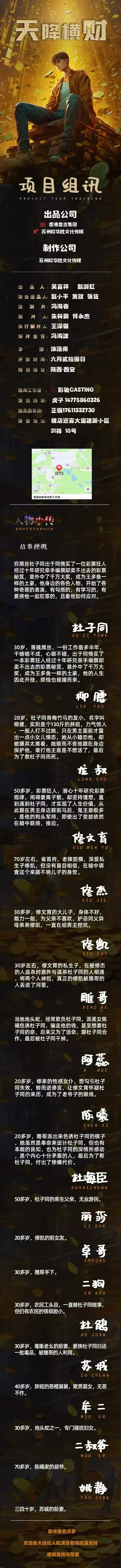 剧中大量人物角色未定,欢迎诸位演员及经纪人朋友踊跃投递资料,期待与您合作。