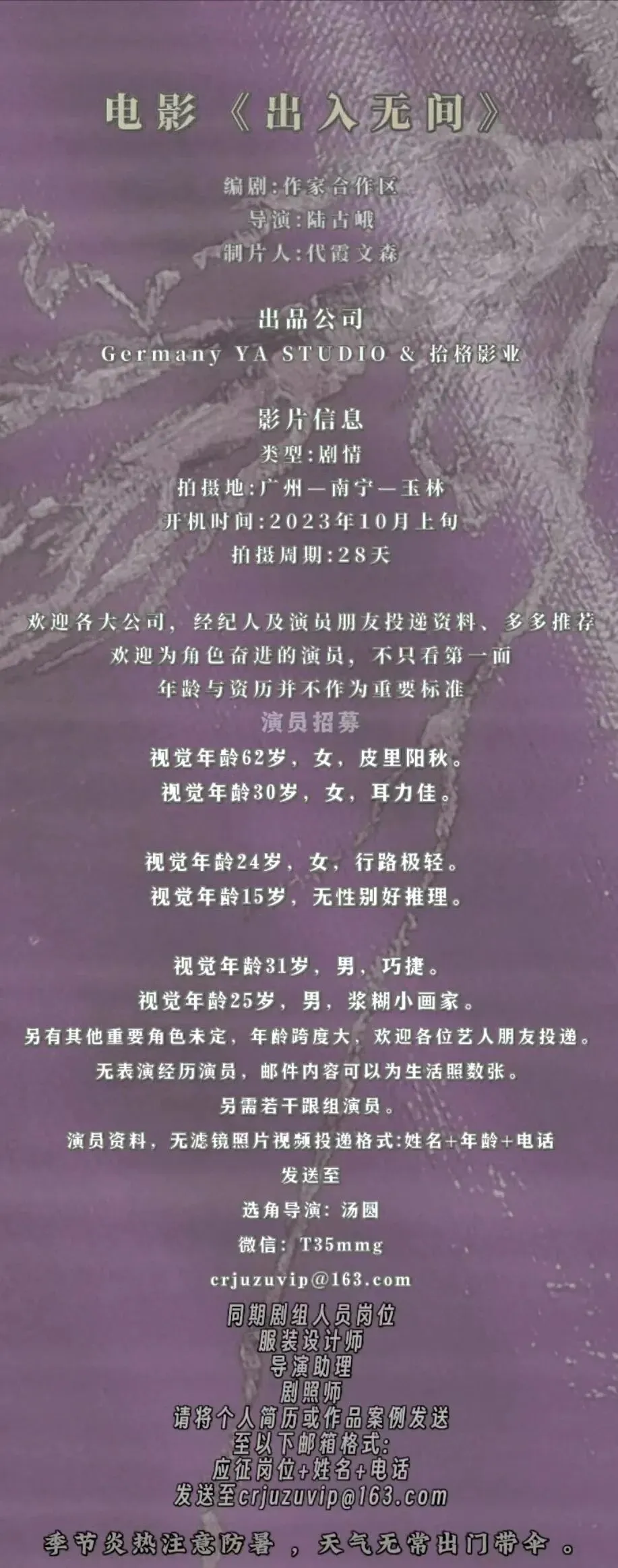 选角负责人:李彭毅 13810544823(微信同步)