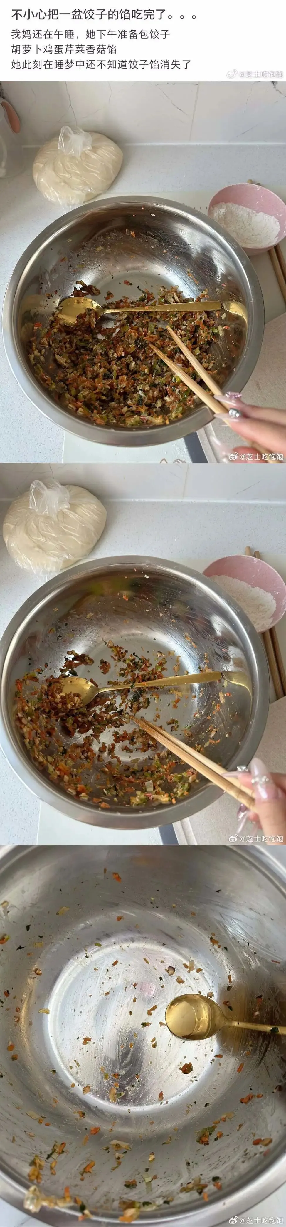 不小心把一盆饺子的馅吃完了。