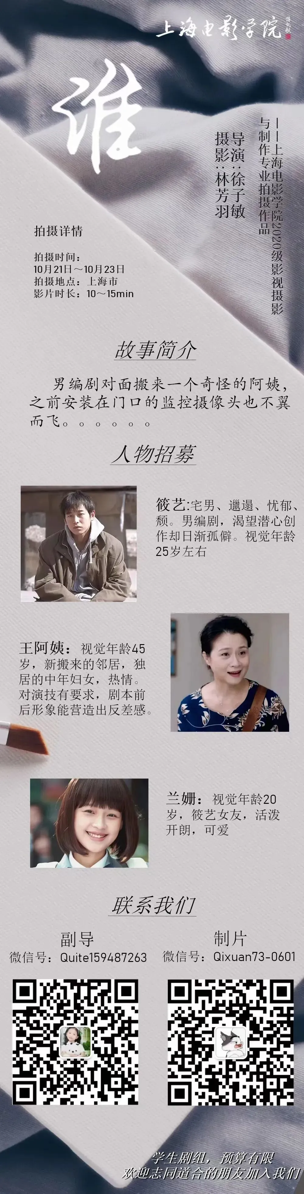 本栏目发布组讯由小编采集与业界共享,组讯如有变化请以实际情况为准。如果遇到剧组收费情况,请谨慎对待并私信官微@戏客Seeker,我们会公示问题组讯并及时处理。谢谢。
