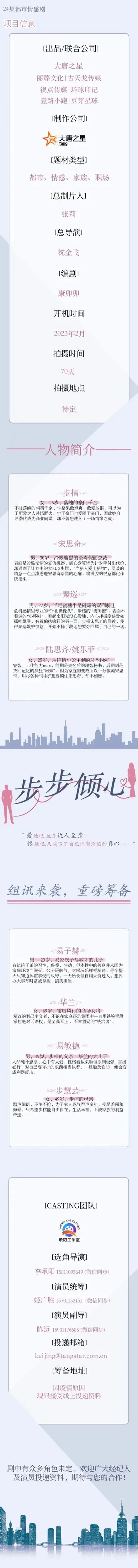 剧中还有大量其他角色,欢迎各经纪公司、演员投递资料。因疫情原因,欢迎大家线上投递资料。