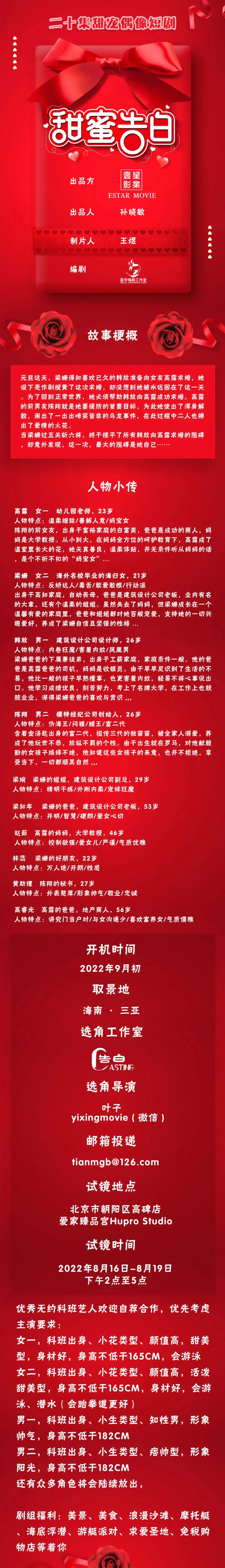 甜宠偶像短剧《甜蜜告白》招募演员