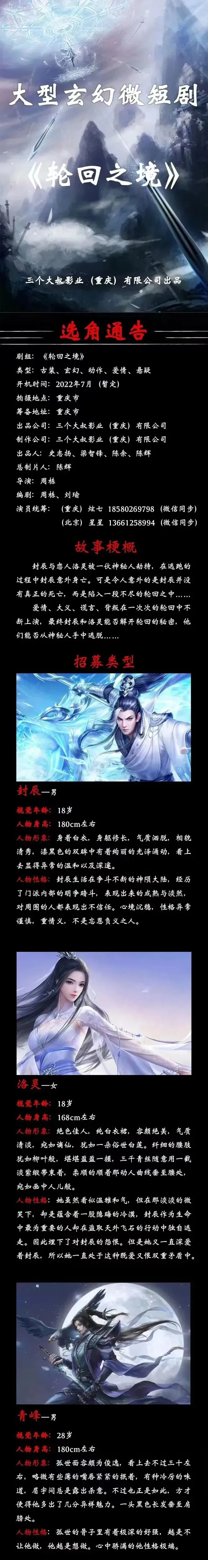 短剧三部筹备,改7月初青岛拍摄。未定角色如下:龙三、上官锦、尚莹莹、莫昊飞、阿布,望各位针对性推荐。