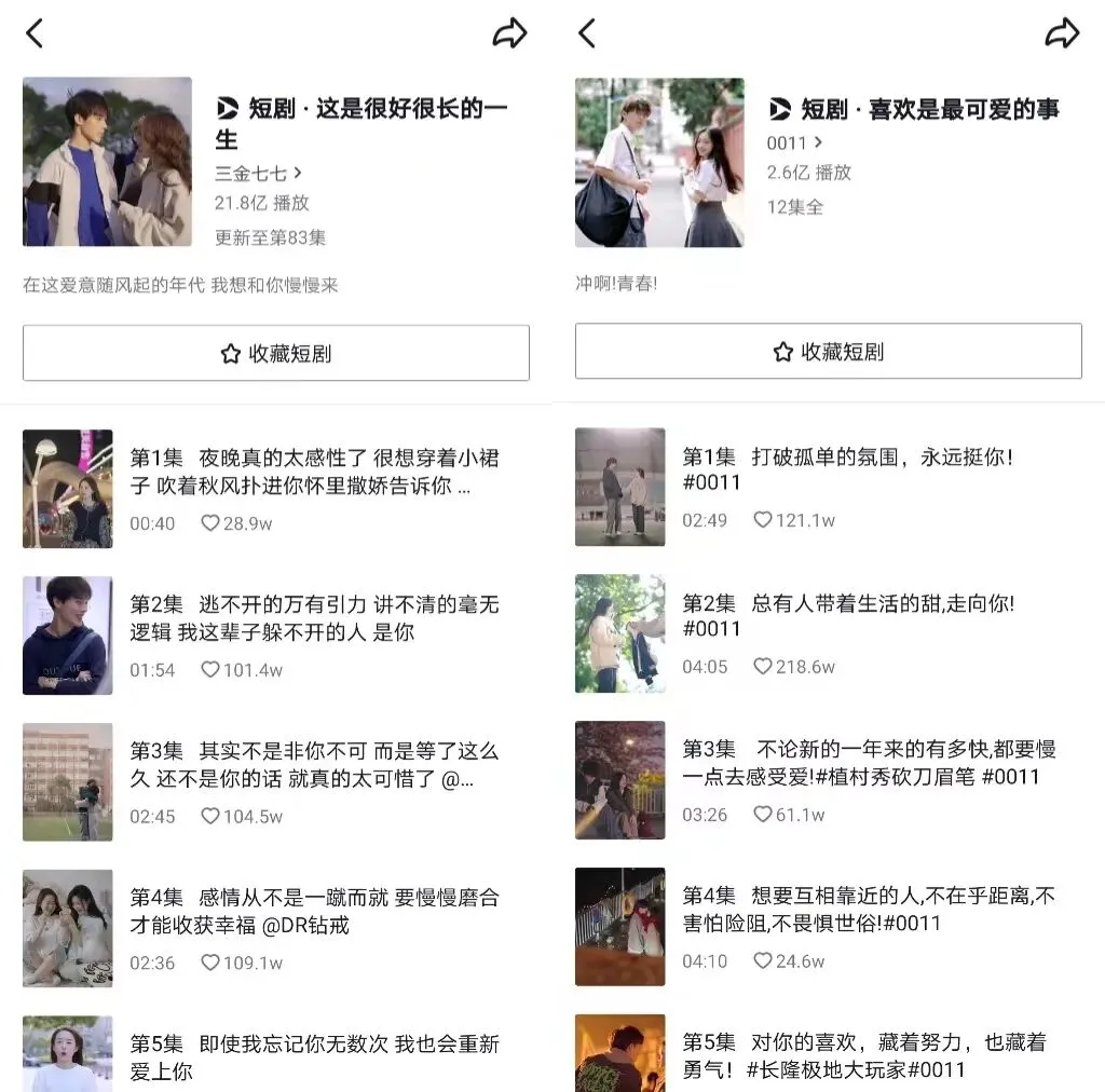 目前来看,恋爱剧情号正朝着这一方向发展。“0011”推出“喜欢是最可爱的事”“王木木过国庆”等短剧,“三金七七”也有“这是很好很长的一生”“百变小七”等短剧,“吴夏帆”也有“恋爱盲盒”“恋爱101次”等主题短剧。