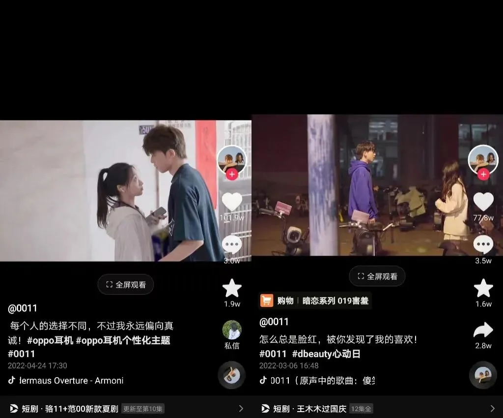 以“0011”为例,账号通过剧情化故事展现心动时让人充满期待的小美好,同时故事主角“范00”“骆十一”则在各自抖音账号中继续“撒糖”,用更加日常化的内容为其人设注入更多“糖分”。