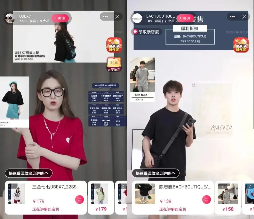 进一步点击进入能发现,店铺中女装来自“UBEX7”淘宝店铺,而男装则来自和“BACHBOUTIQUE”店铺。虽然店铺名称中并不带有账号相关介绍,但是店铺展示都为“三金七七”主人公出镜展示穿搭效果,服装名称也离不开“三金七七”的备注。