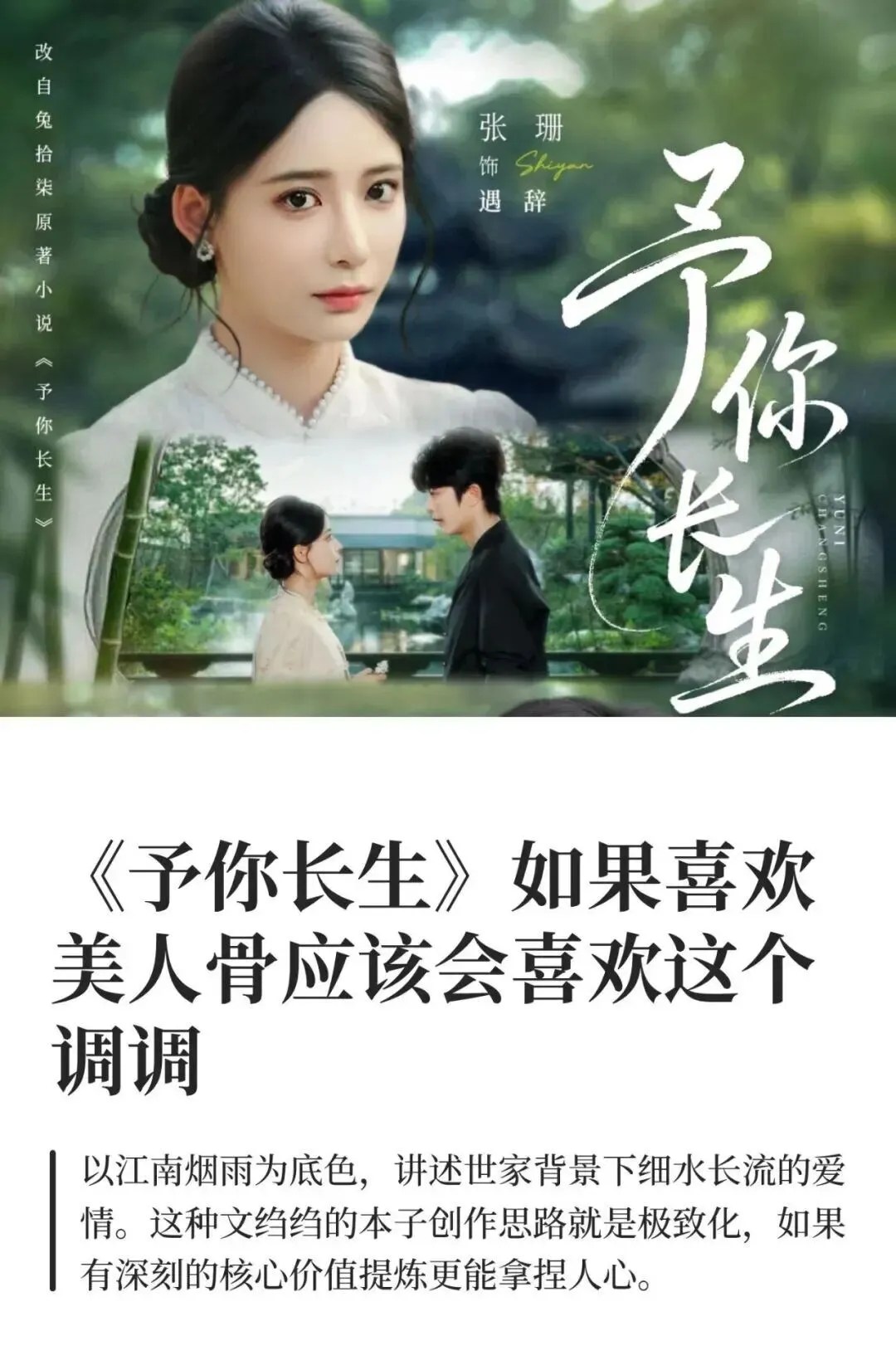 《予你长生》最令人称道的,是它用江南文化特有的含蓄内敛,刻画了一段在宗族礼法之下暗涌的情愫。年长八岁、曾被退婚的傅则奕,与自幼一同长大的遇辞,在细节与留白中悄然靠近。