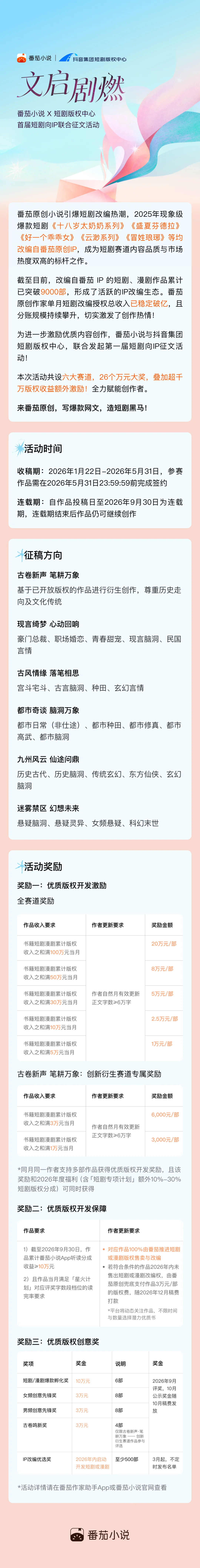 本次活动开设六大创作赛道,覆盖古卷衍生、现言甜宠、古风玄幻等多元题材,为创作者提供充足创作空间,活动设置丰富激励形式,全方位赋能优质原创内容孵化。