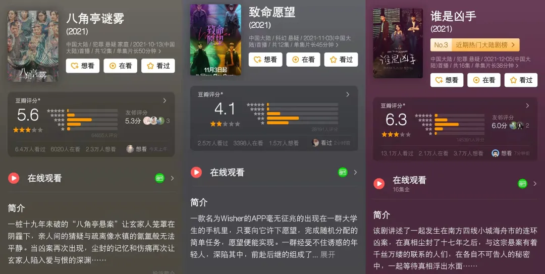 2020年是平台剧场化运营的元年,爱奇艺凭借《沉默的真相》和《隐秘的角落》让迷雾剧场火了一把。到了2021年,在用户分众、平台竞争激烈、短视频夹击的局面下,其他平台纷纷效仿爱奇艺,加码剧场化运营,增加剧场数量、引入微短剧剧场、开设非类型化剧场,一时间剧场化运营热火朝天。但是,平台当前的剧场化运营是否奏效,是否所有的类型剧都适合进入剧场,剧场就一定是质量和口碑的保证吗?盘点2021年各大平台的剧场化运营,不难看出,剧场虽然扎堆出现,但能留住观众的并不多。剧场化运营究竟怎么玩,平台方似乎还没找到适合自己的玩法。短视频已经成为“杀”时间的利器。《2021年中国网络视听发展研究报告》显示,短视频用户规模达到8.73亿,日均的短视频产品使用长度达到了125分钟。如此庞大的用户规模,势必带来对短视频内容需求的升级。2021年的剧场化运营,爱优腾芒纷纷开启以短剧为代表的短视频赛道的布局。在剧场化运营上久久按兵不动的腾讯视频,2021年年末,正式发布了首个专门的微短剧品牌“十分剧场”,提出微短剧的“十分美学”。 “十分剧场”中的“十分”,代表着十分钟左右的微短剧时长,该剧场规划进行全年分季式播出,内容涵盖喜剧季、国风季、互动季、悬疑季等,兼具文化IP、文化创新、漫改喜剧、热血英雄、悬疑推理、古装美食、奇幻治愈等主流题材与新鲜题材。从云合数据正片有效播放来看,2021年腾讯视频不仅在年度Top10的微短剧中一家独占6部,更包揽了冠亚季军。优酷在2019年就以小剧场的形式批量生产短剧,短剧剧场已经是优酷的剧场之一。2021年,优酷又加速了短剧的精品化和规模化。首先,优酷升级了短剧分账规则、上调分账单价,将S级项目单价翻倍提升至6元,流量分账单价提升至每1000次有效播放60元,以此吸引更多的制作方打造优质内容。之后,优酷又发布了“扶摇计划”和“好故事计划”,为短剧项目提供全方位支持,同时鼓励原创IP,解决优质短剧的产能不足的问题。芒果TV“大芒计划”中的 “下饭剧场”,同样主打短剧。下饭剧场以甜宠、情感类短剧作为细分切口,满足平台女性用户对短剧内容的刚性需求,未来逐步拓展悬疑推理、情景喜剧、现实话题等。目前,下饭剧场已经上线50多部短剧。另一边的爱奇艺,一直主打精品短剧。除了主推悬疑内容的迷雾剧场和主推甜宠内容的恋恋剧场之外,其剧场化矩阵还在不断拓展。主打喜剧内容的“小逗剧场”发布了《瓦舍江湖》《医是医,二是二》《破事精英》等储备剧单,在题材选择和风格设定上各有特色。除了爱优腾芒四家长视频平台外,抖音、快手、B站也纷纷押注微短剧。去年一整年,快手宣布尝试短剧付费模式,并将“快手星芒计划”升级为“快手星芒短剧”。抖音在去年年初宣布进军微短剧赛道,之后在4月启动了短剧新番计划,年末时传出了短剧付费的内测消息。B站的微短剧剧场“轻剧场”,于去年8月上线。在此之前,B站以融资的形式获得了兔狲文化传媒10%的股份,该公司曾与B站有过微短剧上的合作。悬疑剧场是2021年的热门赛道。根据灯塔专业版数据,截至2021年11月21日,2021年共上线92部悬疑类剧集,上新数在各类型中排名第六,悬疑类型市场占有率为9.31%,在各类型中排名第五。为了产出好故事,平台纷纷深度绑定文学IP。未播的《回廊亭》,改编自日本推理作家东野圭吾的作品《回廊亭杀人事件》。为了打造属于优酷的悬疑迷宫,在2021年10月份的精品先鉴会上,优酷宣布签下此前紫金陈,将在未来5年内一起打造3个系列共10部悬疑作品。此前爱奇艺迷雾剧场的高分悬疑剧,均改编自紫金陈的小说。告别紫金陈的爱奇艺,也和其他悬疑作家携手,《平原上的摩西》改编自双雪涛的同名中篇小说,《淘金》则改编自黑岩阅读网签约作者张二健的同名小说。其次,悬疑剧的团队配置不断升级,实力老将与年轻演员搭档。以迷雾剧场的《八角亭谜雾》为例,由第六代电影导演王小帅执导,段奕宏、郝蕾、祖峰出演。接下来待播的剧中,有张译、王俊凯的新剧《重生之门》,张新成、邓家佳主演的《回廊亭》,夏雨和罗晋共同演绎的《庭外》,欧豪、王砚辉出演的《胆小鬼》。但是,在重磅投入之下,风头大盛的悬疑剧场却没能稳固好自己的口碑。迷雾剧场目前上线三部,开篇之作《八角亭谜雾》,虽有实力演员助阵,由于节奏缓慢、叙述混乱,豆瓣评分仅5.6,远未达到及格水平,被网友评价“浪费班底”;紧随其后的《致命愿望》,“播前万众期待,播后悄无声息”,豆瓣评分4.1;《谁是凶手》,开播时陷入道具风波之中,豆瓣评分6.3,算是为接连扑街的迷雾剧场“挽尊”了,不过和去年同期的热度和好评相差甚远。至于优酷悬疑剧场的《真相》、《也平凡》和芒果TV季风剧场的《第十二秒》、《谎言真探》,均在豆瓣6分以下。难得有一部讲述缉毒人员的《玫瑰行者》,豆瓣7.2分,但由于缺乏出圈引流点,热度普通,被市场冷落。目前,各大平台待播的悬疑剧不少,后续表现还需要时间来检验。有了2021年的前车之鉴,观众势必会对2022年的悬疑剧场降低期待。剧场化运营是平台瞄准分众市场的产物,但若一味地强调某种特定风格的元素,难免会出现大量同质化的内容,引起用户审美疲劳。悬疑剧场之外,甜宠剧场就是2021年剧场化运营的另一条赛道了。甜宠剧制作成本低,市场受众广,容